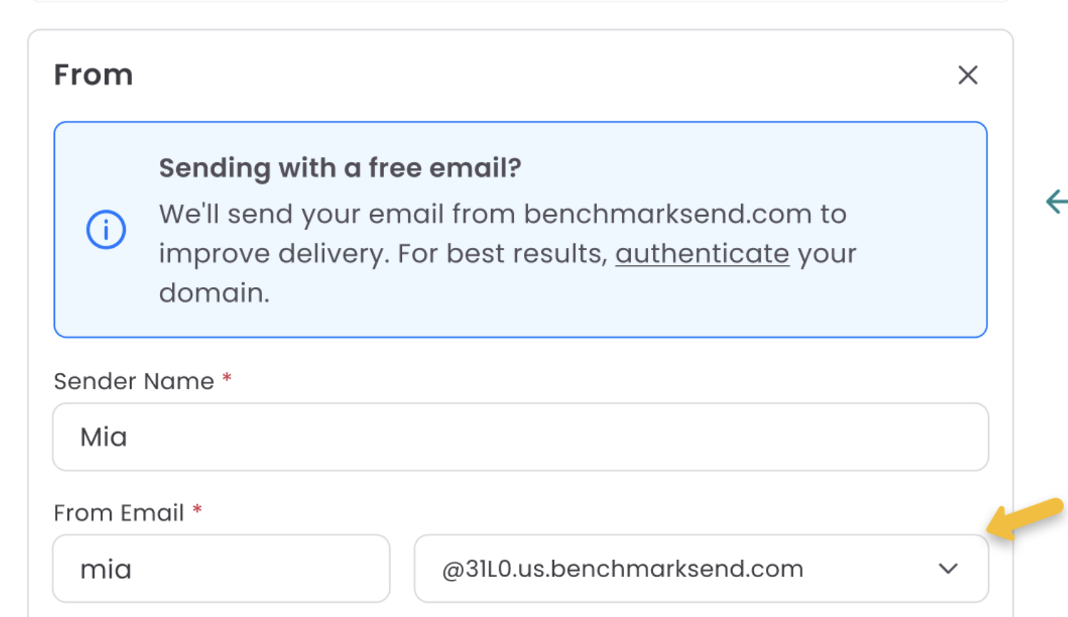 Without email domain authentication, your emails won't meet the requirements set by inbox providers like Gmail, Yahoo, Outlook, and others. If you're unable to authenticate your domain or are using a free domain like Gmail or Yahoo, your emails will be sent from our authenticated Benchmark shared domain.
