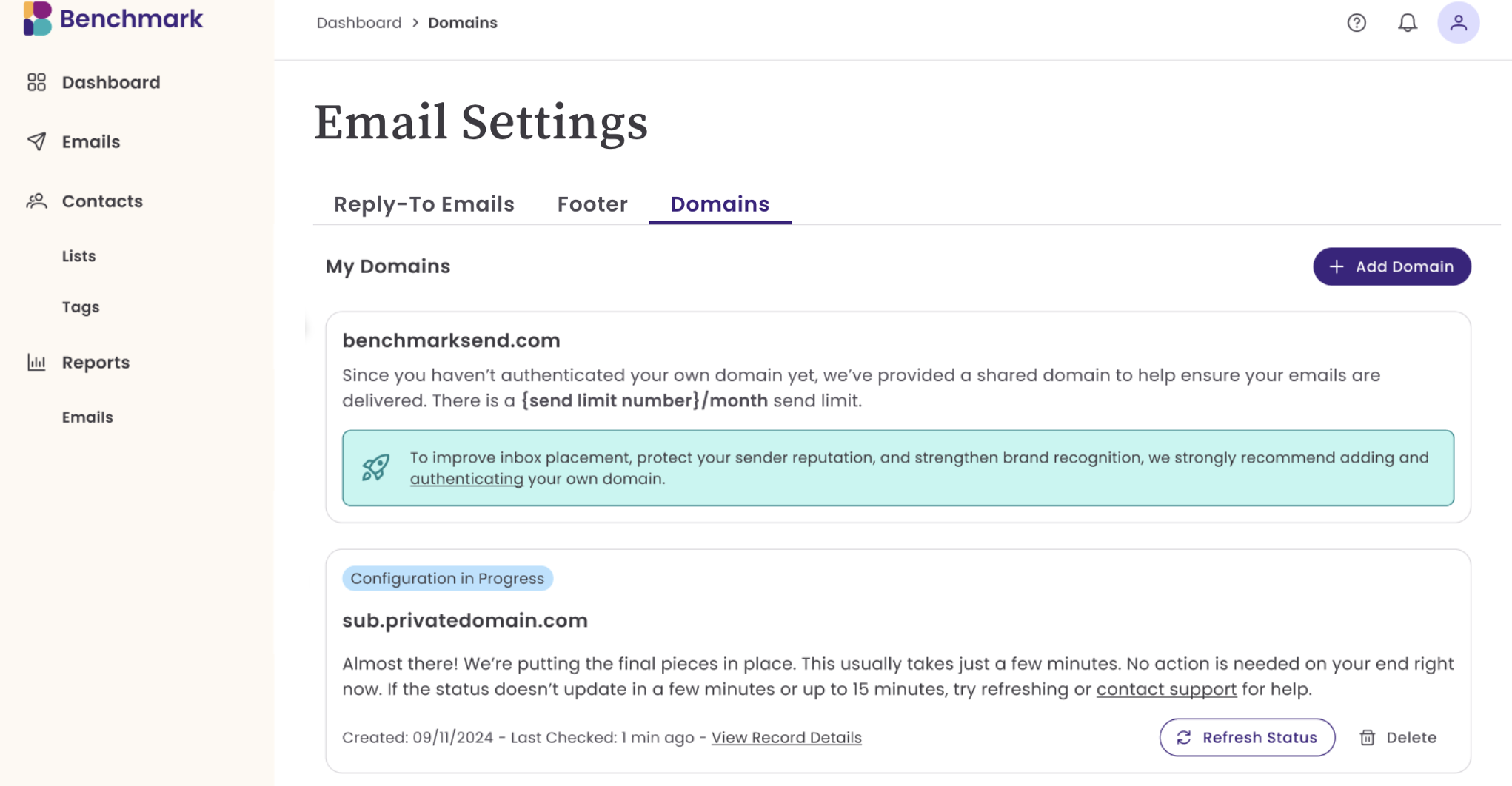 Authenticating your domain in Benchmark Email not only gives you higher sending limits and better control but also strengthens your brand reputation and improves the chances your emails will reach the inbox.