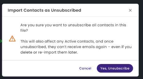 What’s new: A new warning confirms when you’re about to unsubscribe all contacts in a file during import – a previously easy-to-miss step.