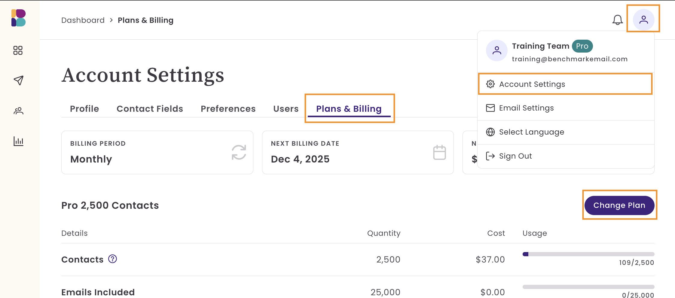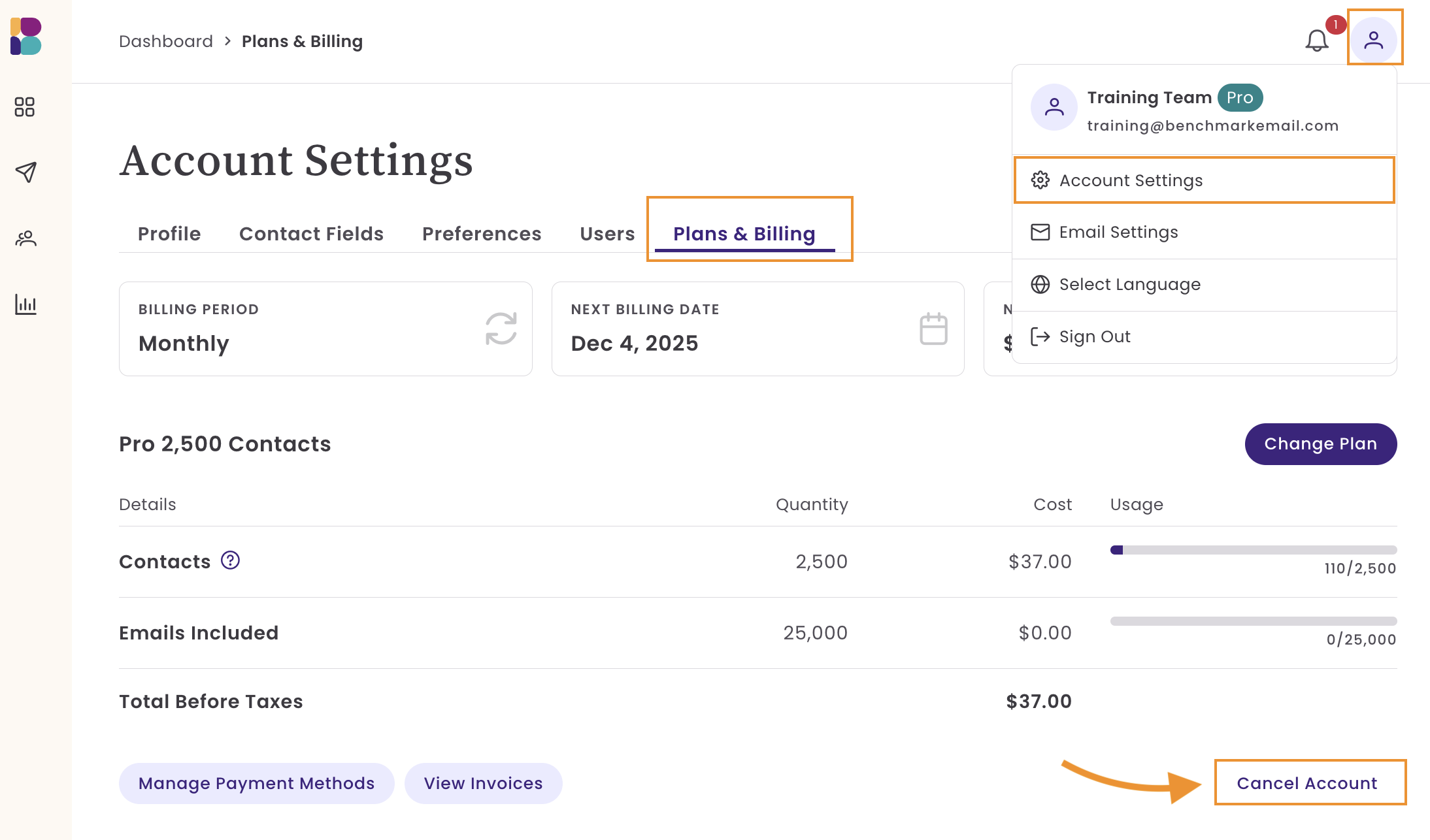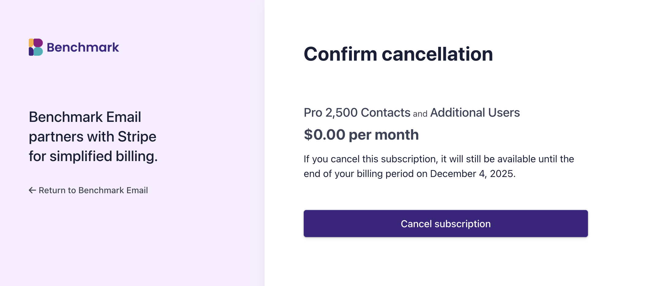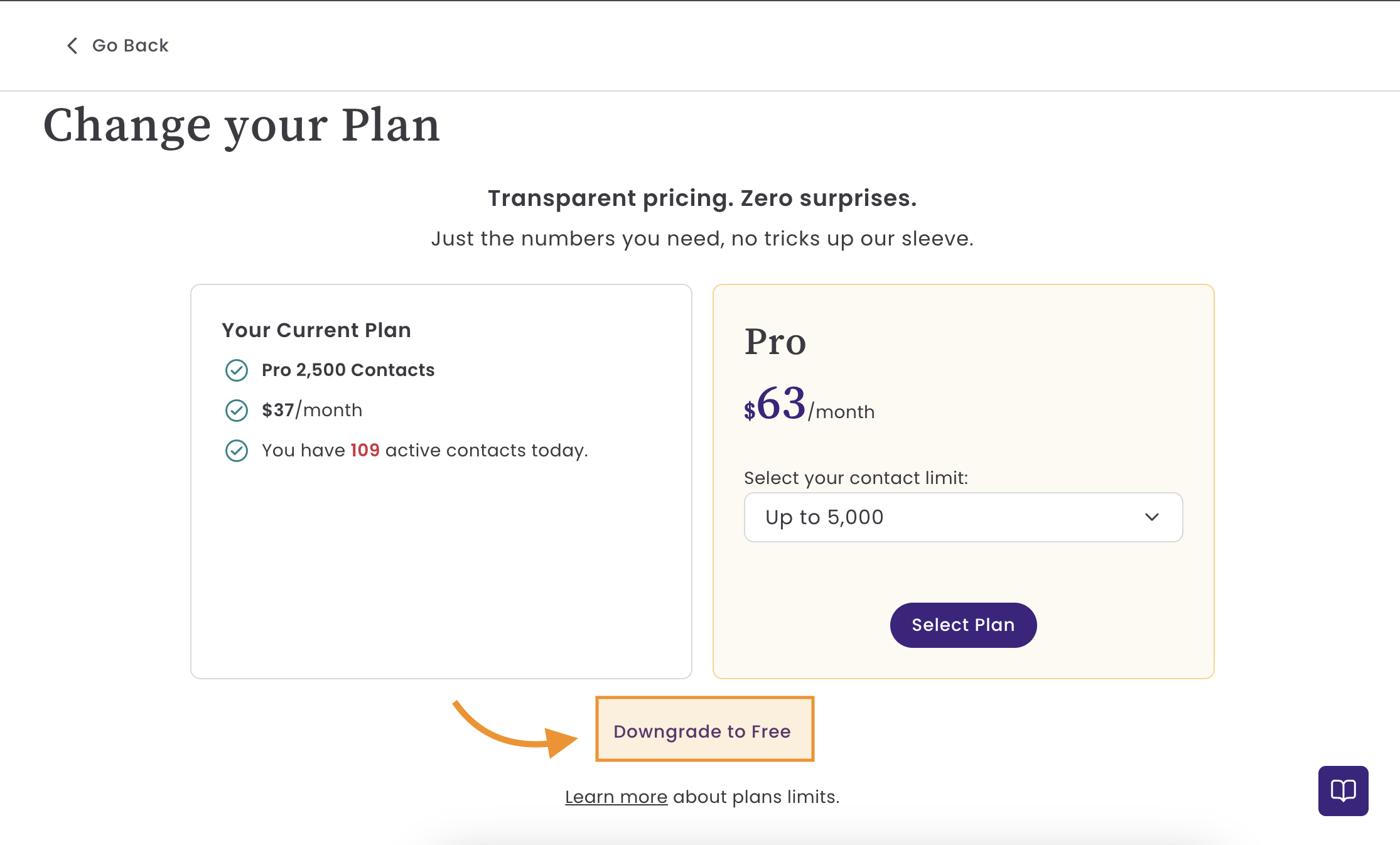 If there are times of the year when you don’t use email marketing, you can either cancel your paid subscription or downgrade to the Free plan. We recommend downgrading to the Free plan if you anticipate using your account again. This option allows you to retain your data, including email reports, contacts, and contact activity.