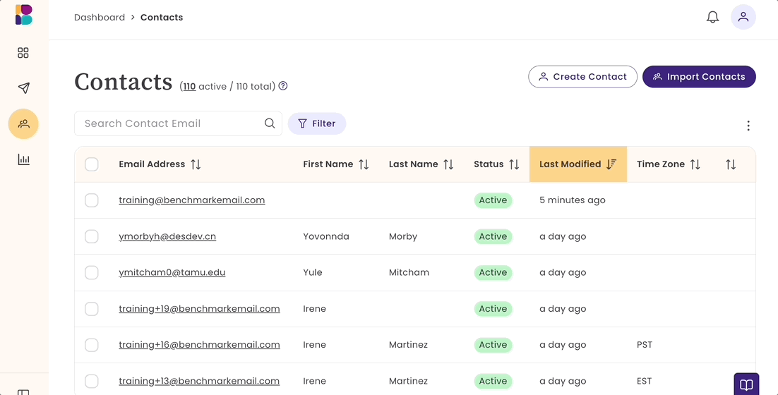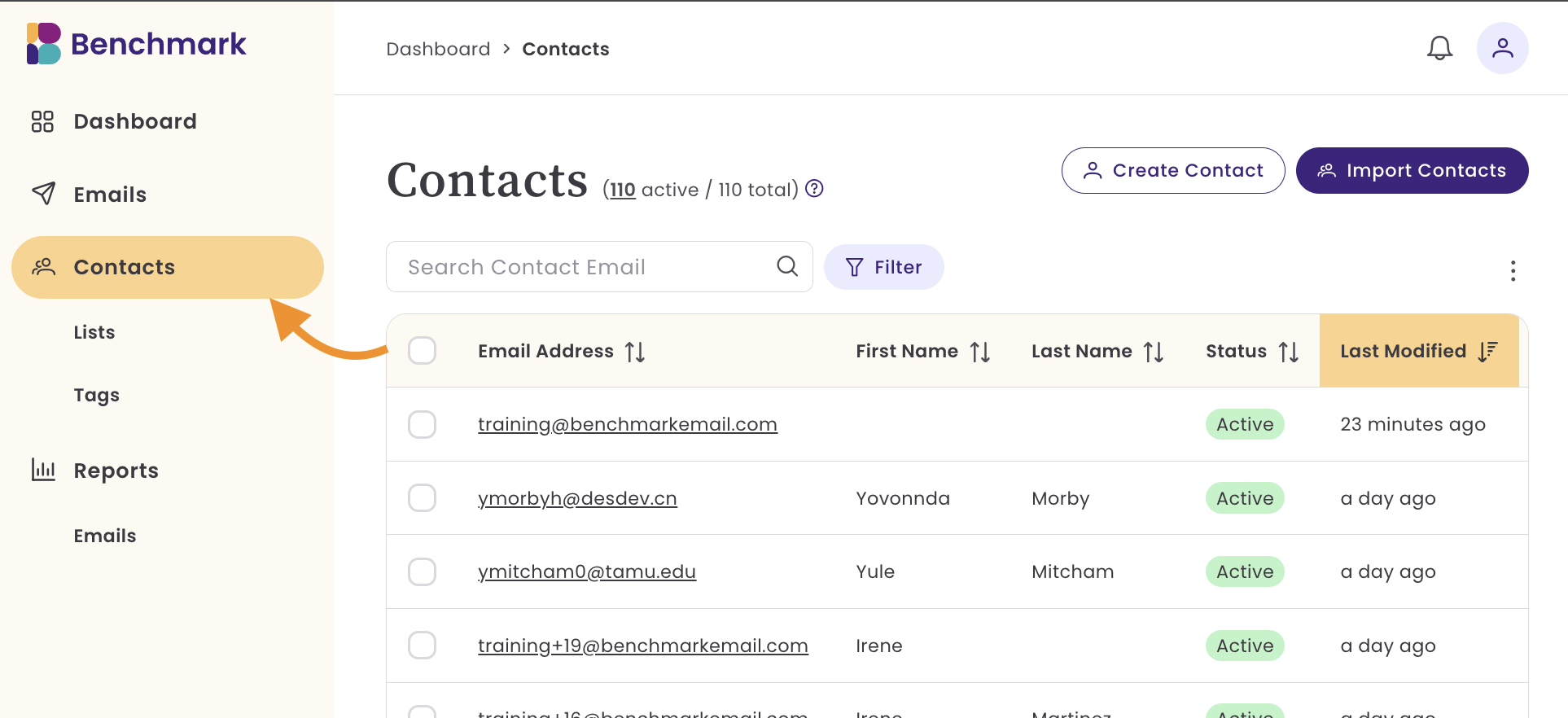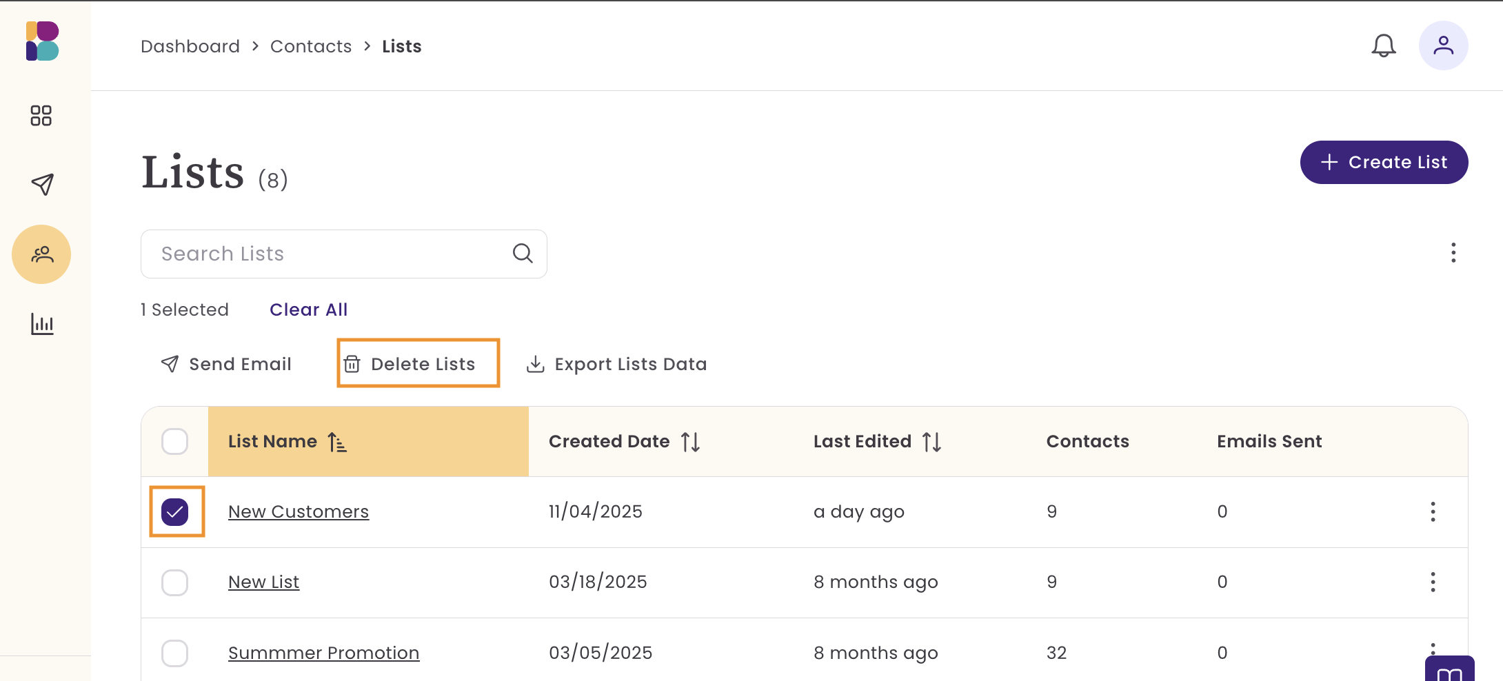 - From your account dashboard, hover over Contacts and select Lists.