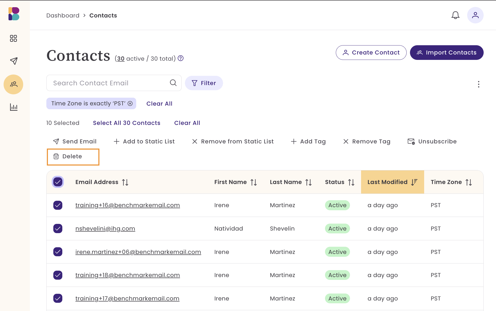 When you delete a contact list, only the list itself is removed; the contacts within it remain intact. The contacts inside that list are not deleted from your account and will remain available on the Contacts page.