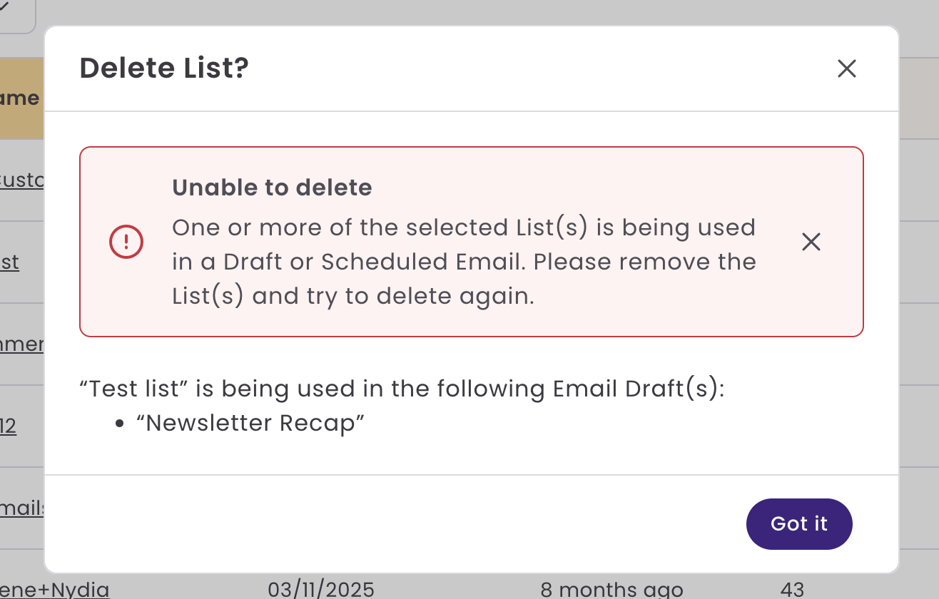 - Lists that are actively being used in a scheduled or assigned in a draft email can not be deleted.