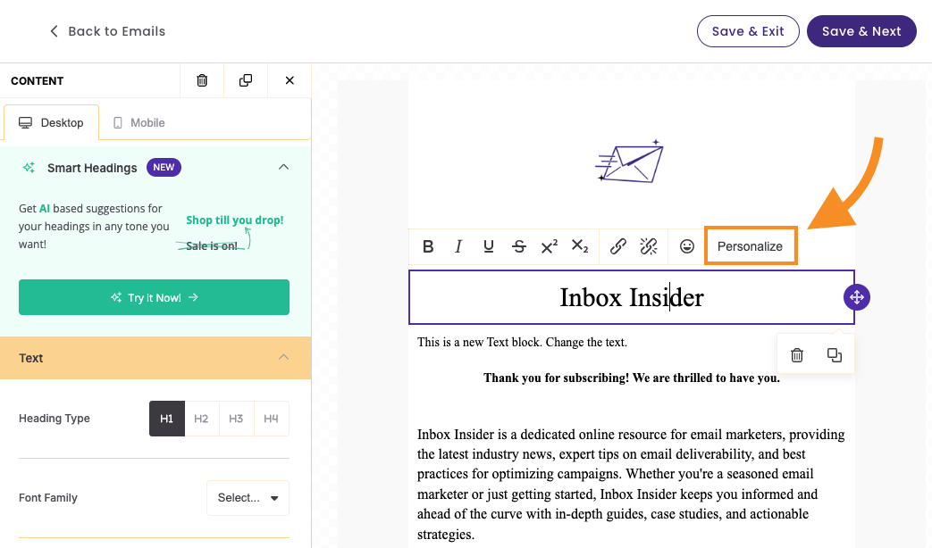 A simple way to add personalization can start with the subject line of your email. Use fields like the first name or custom fields to add a personal touch.