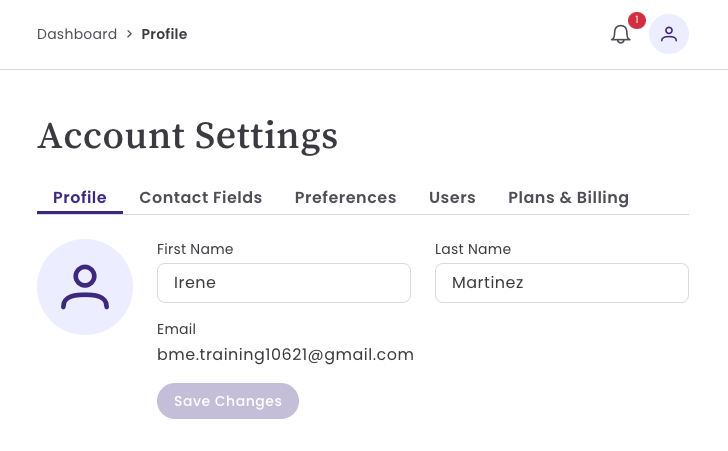 The profile page displays the account owner's information. You can update the first and last name, but the associated email address cannot be changed. If you need to change the account's email address, contact our support team.