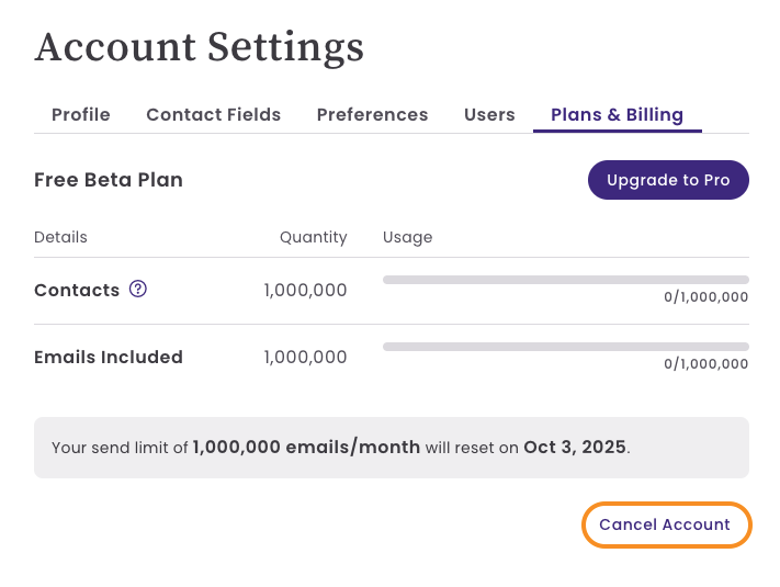 Here you can review the details of your current plan, make changes by upgrading or downgrading, or cancel your account. At the bottom of the page, you’ll also find your plan’s renewal date and a summary of your monthly send limit.