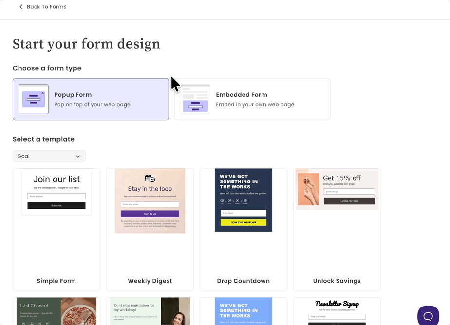 Popup forms follow a 5-step creation flow to help you build and publish quickly: