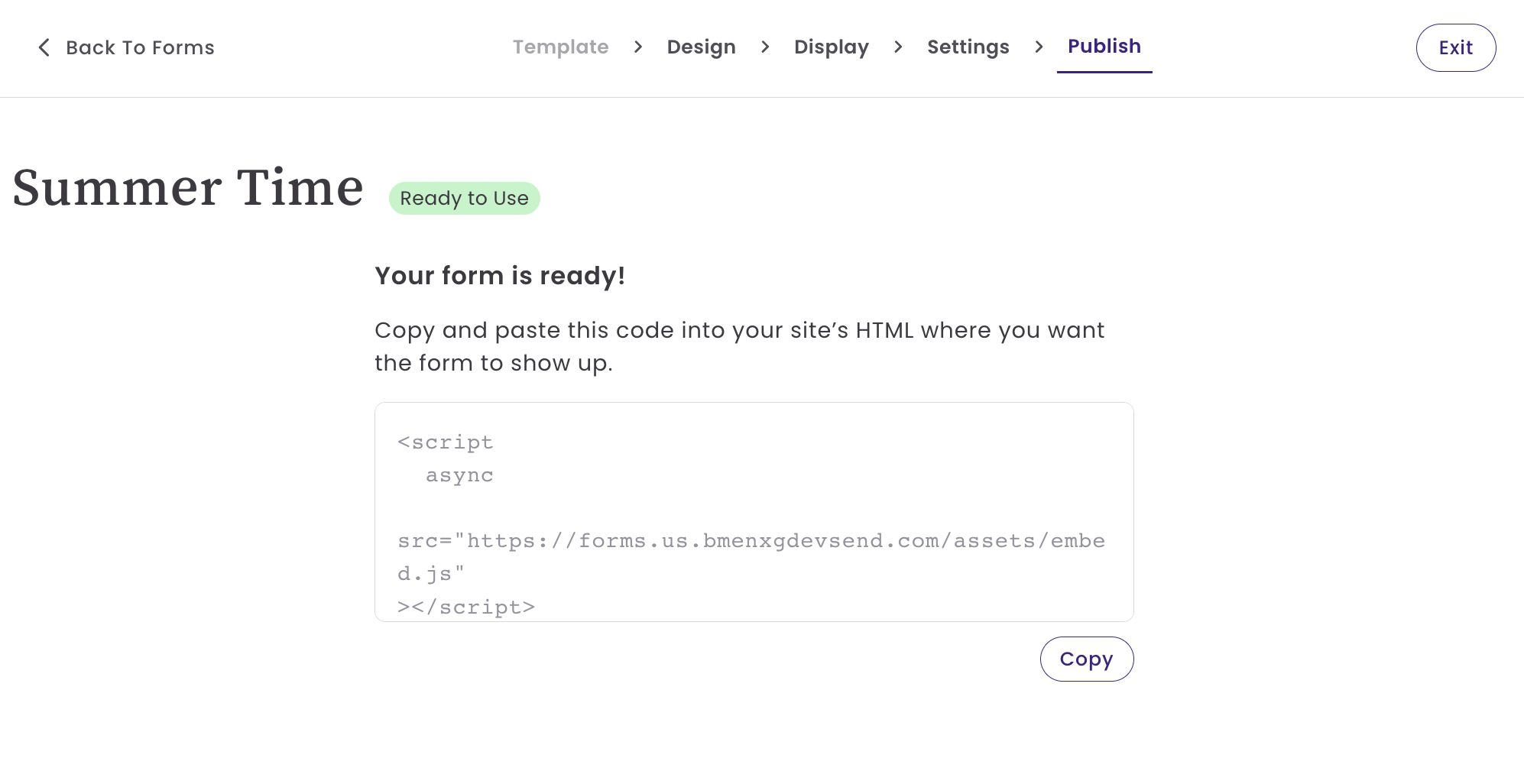 The Publish page provides the embed code for your signup form. To display the form on your website, paste the form's code into an HTML or Custom Code block within your website editor.
