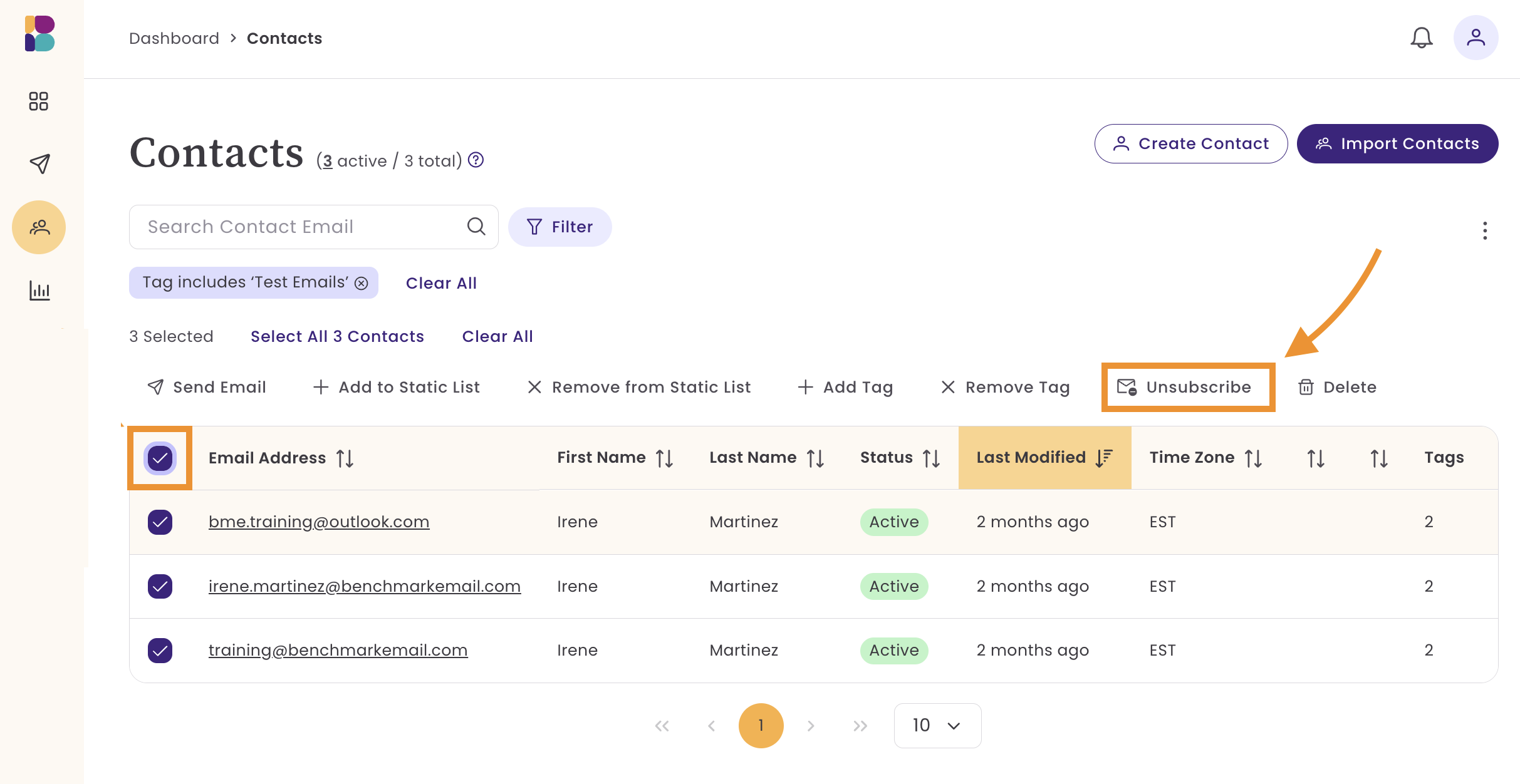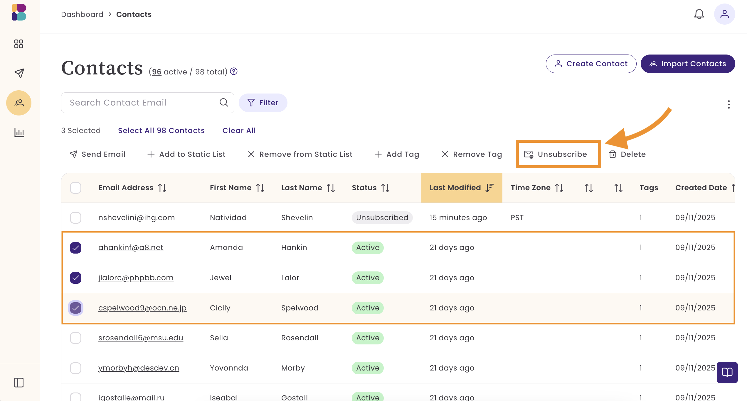 The same steps can be used when Unsubscribing contacts in a contact list. Be sure to deselect any contacts who have unsubscribed so you can remove multiple contacts at once.