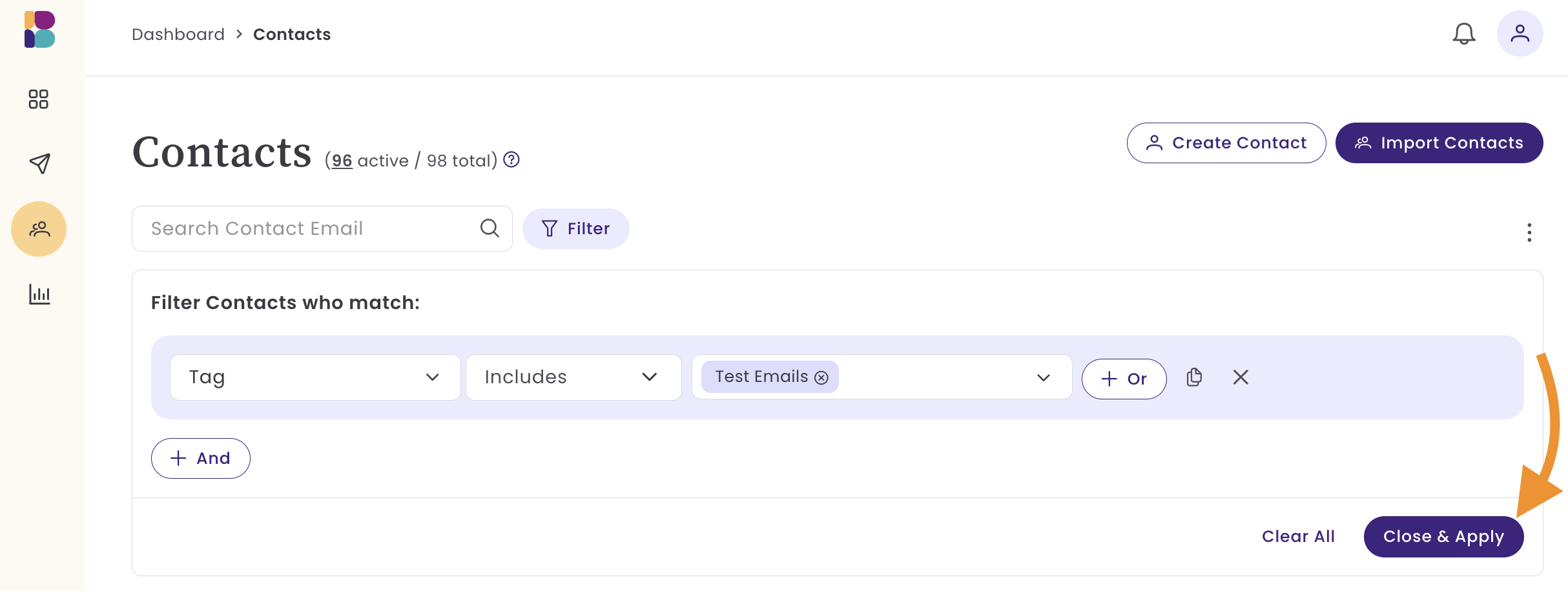 Contact with multiple emails: This contact may have more than one email address, and only one of them has been unsubscribed. The filter options in the Contacts dashboard let you filter contacts by name, domain, and other criteria.