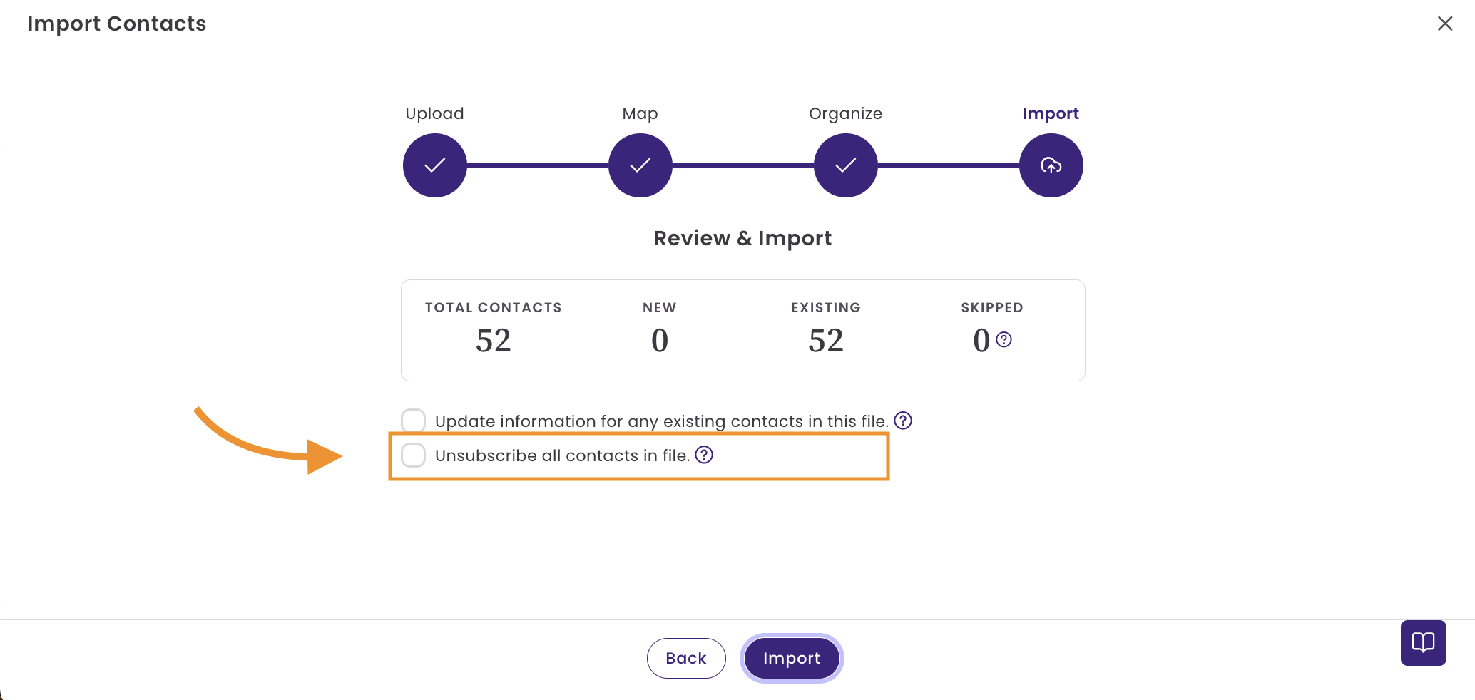 Selecting this option will unsubscribe all contacts in the list, including any contacts already in the account.