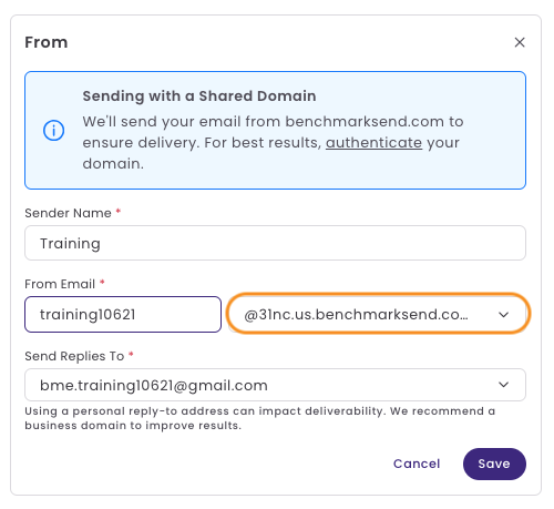 If you cannot authenticate your domain or encounter an error during the authentication process, your emails will be sent using our shared domain. When sending an email from a shared domain, the From address will appear like this: yourname@001a0.us.benchmarksend.com.
